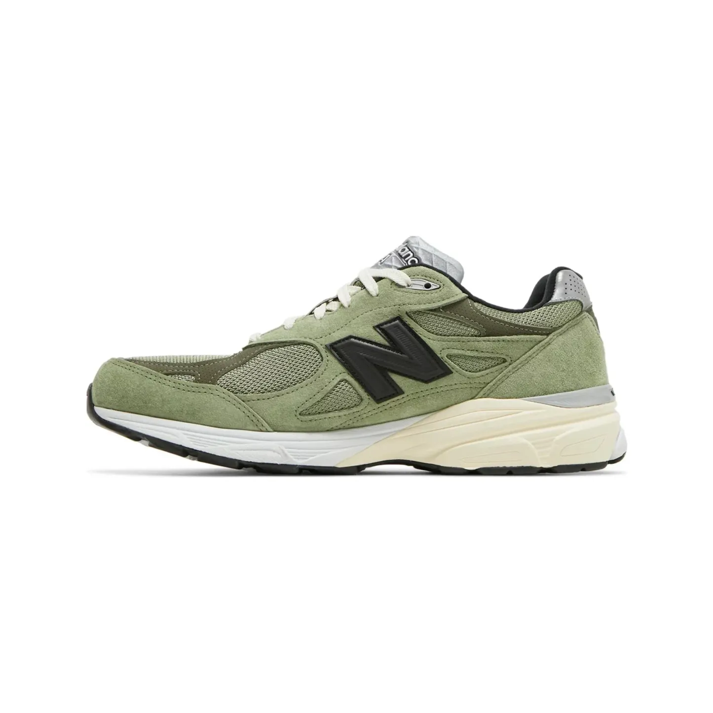 The New Balance 990v3 JJJJound Olive adopts a minimalist design strategy to create a shoe designed for everyday wear. It comes with olive mesh and quality suede uppers. The tone green base is sharply contrasted by the black New Balance emblems and overlays. A personalized touch is provided with a silver reflective heel wrap with JJJJound logo. The design is then finished off with a cream ENCAP sole at the base.